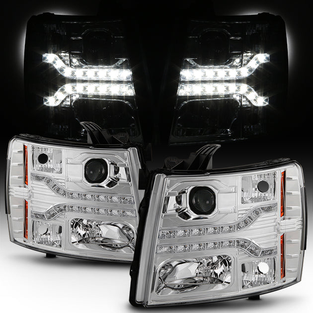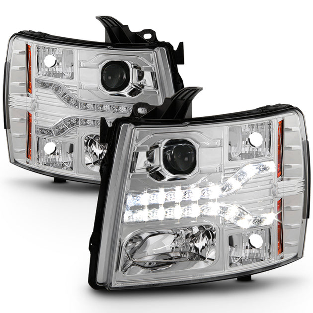 AKKON - For GMT900 Chevy Silverado Pickup Truck Dual LED DRL Chrome Housing Projector Headlights Lamps