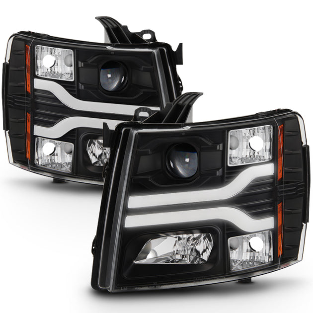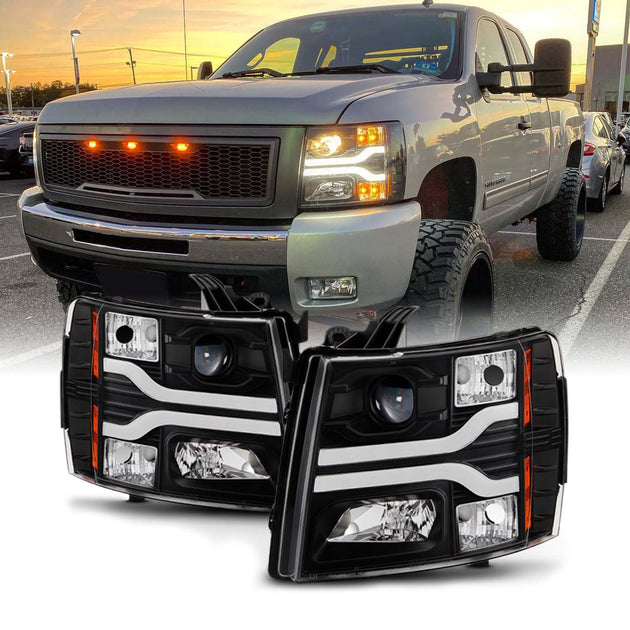 AKKON - For GMT900 Chevy Silverado Pickup Truck Dual LED Tube DRL Black Projector Headlights Pairs Lamps