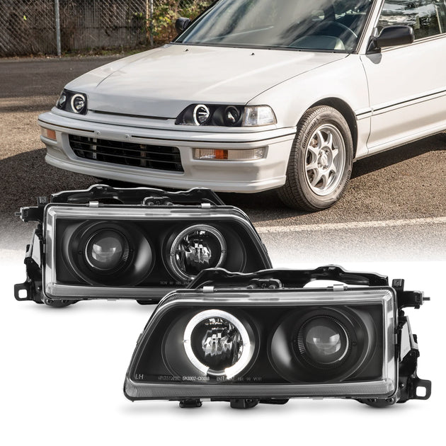 AKKON - For Honda Civic CRX Black Bezel Halo Ring Design Projector Headlights Front Replacement Left + Right