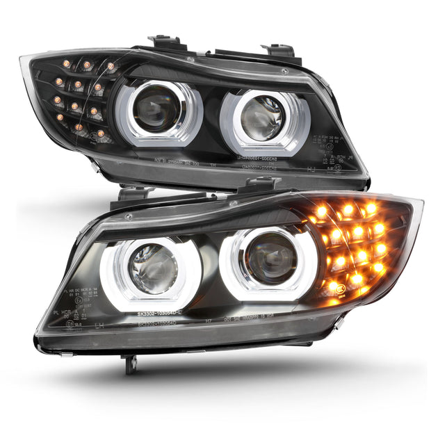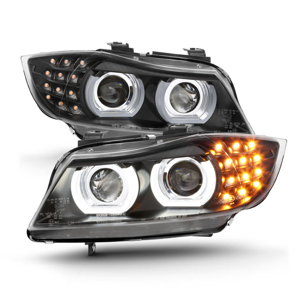 AKKON - Fits 2009-2011 BMW 323i 335i M3 Sedan / 328 Wagon [Halogen Type] 3D Halo Projector Black Headlights w/ LED Turn Signal