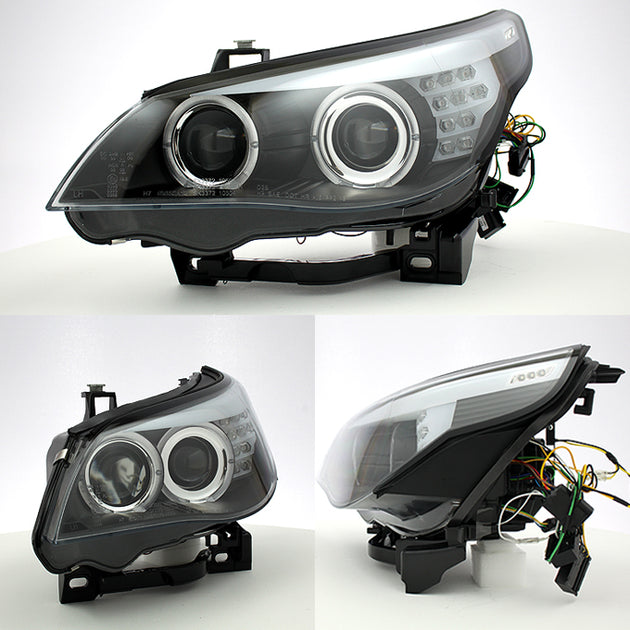 AKKON - For BMW E60 5 Series Black Bezel HID Type Dual CCFL Halo Projector Headlights w/Full LED Turn Signal