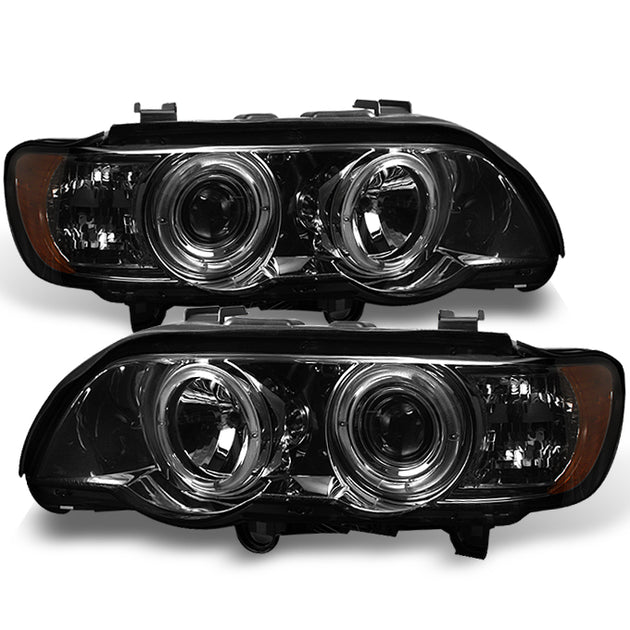 AKKON - For BMW E53 X5 SUV Halogen Type Black Bezel Dual Halo Ring Projector Headlights Front Lamps Replacement