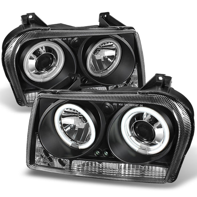 AKKON - For Chrysler 300 Sedan Halogen Type Black Bezel Dual Halo Rings Design Projector Headlights Lamps Pair