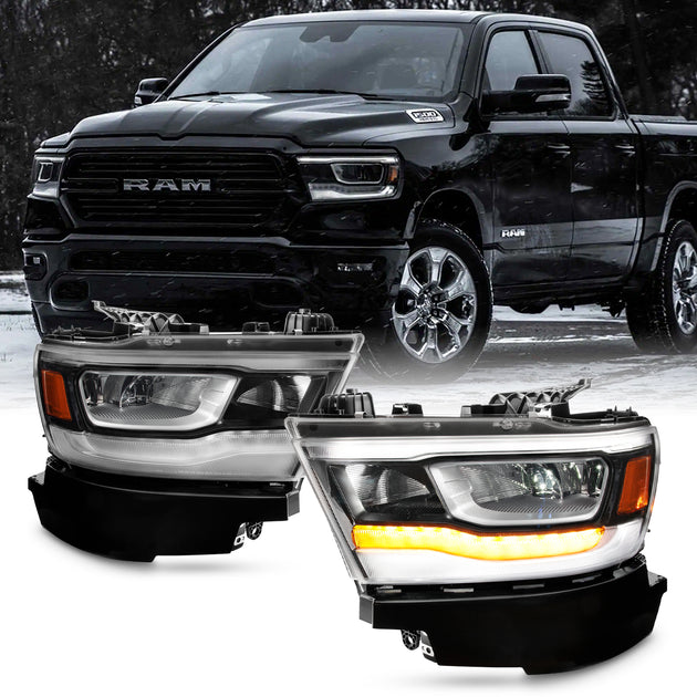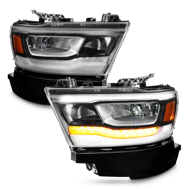 AKKON - Fits 2019-2023 Ram 1500 [Full LED] Tube Running Turn Signal Headlights w/ Chrome Bezel Reflector Pair Left+Right