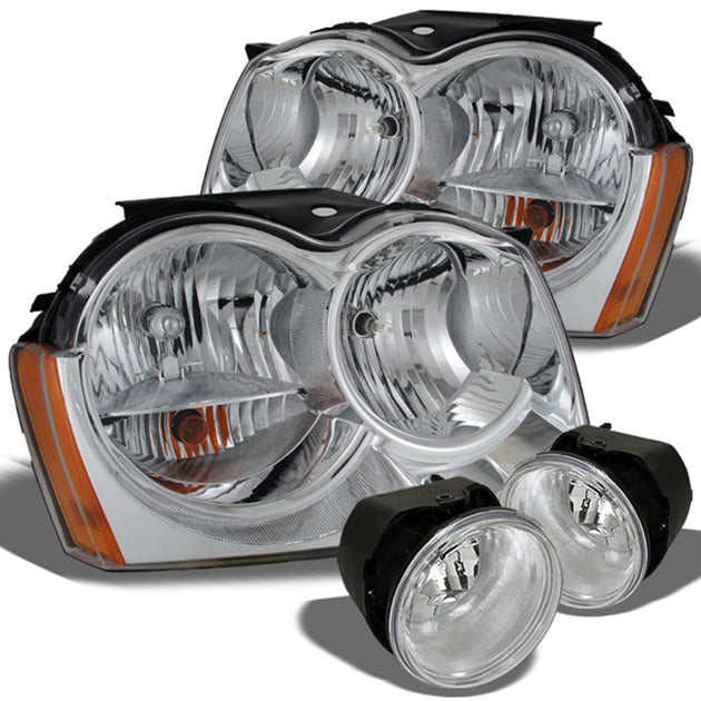 AKKON - For 2005 2006 2007 Grand Cherokee Chrome Clear Headlights Replacement + Clear Fog Lights Pair Left Driver + Passenger Passenger