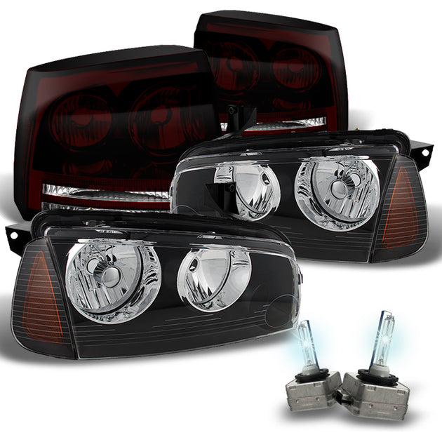 AKKON - For Dodge Charger Black HID Type Projector Headlights + Dark Red Tail Lights + 6000K D1S HID Bulbs