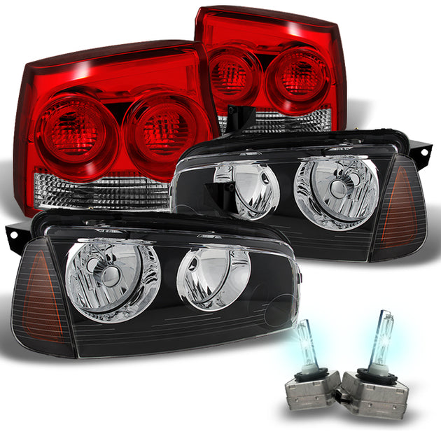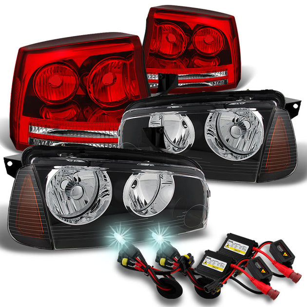 AKKON - For Dodge Charger Black Headlights w/ Corner Lights + Red Clear Tail Lights + Slim Ballast 6000K HID Kit
