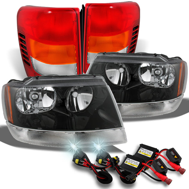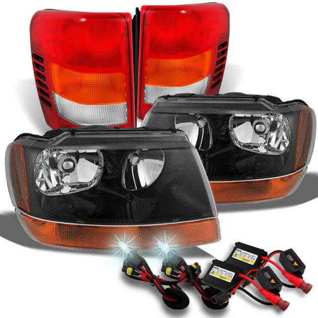 AKKON - For Jeep Grand Cherokee SUV Amber Clear Headlights + Red Clear Tail Lights Pair Set + Slim 8000K HID Kit