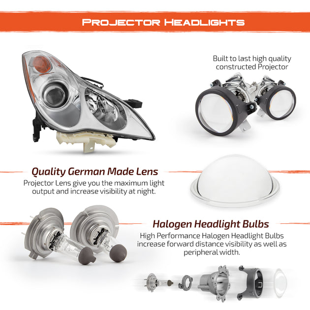 AKKON - Fits 2008-2012 Infiniti EX35 2013 EX37 2014-2017 QX50 [Halogen Type] Projector Chrome Headlight Driver Left Side