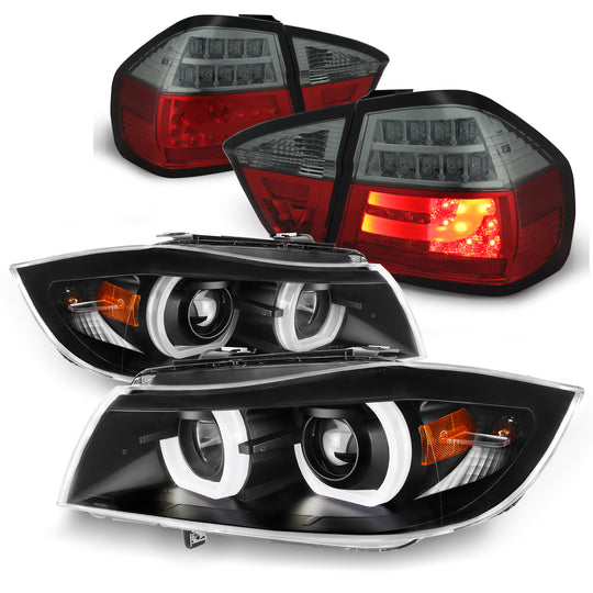AKKON - For 2006 2007 2008 BMW E90 3-Series Sedan 3D LED U-Halo Black Projector Headlights + LED Strip Smoked Tail lamp