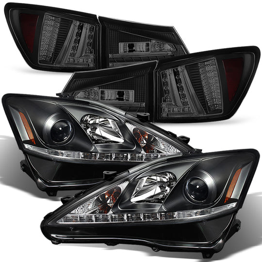 AKKON - For 2006-2009 Lexus IS250 IS350 (Halogen) Black LED DRL Projector Headlights+LED Black Smoke Tail Lights