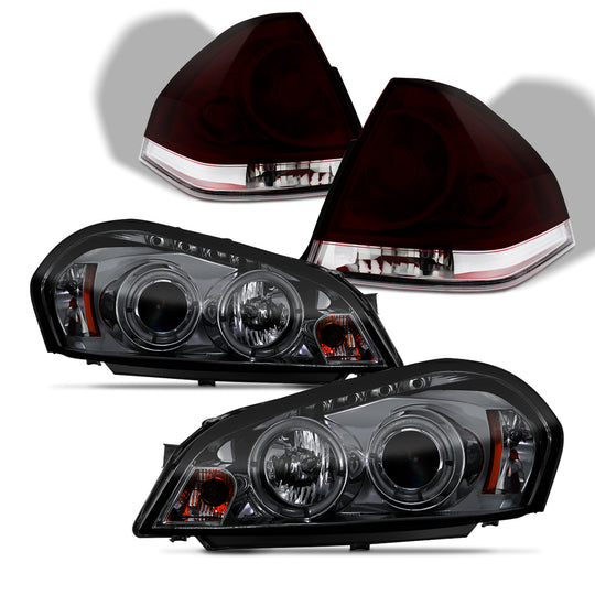 AKKON - For 2006-2013 Chevy Impala / Limited LED Dual Halo DRL Projector Headlights + Red Tail Lamps [Smoke Len Housing]