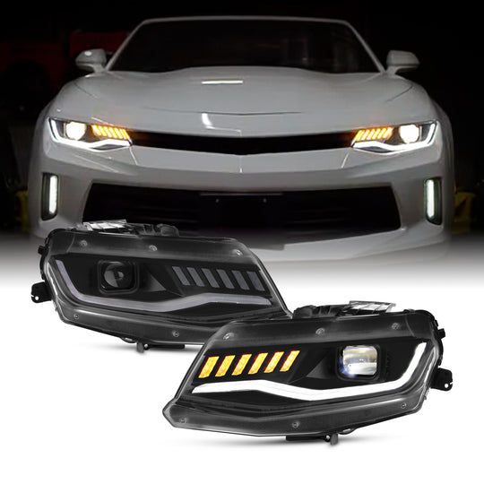 AKKON - Fit 2016 2017 2018 Chevy Camaro FULL LED DRL Switchback Sequential Triple Lens Projector Headlights Black