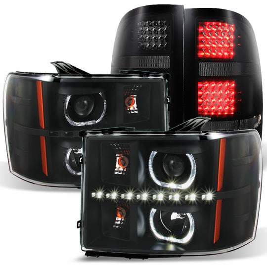 AKKON - For 2007-2014 GAZE GMC Sierra Black Halo Projector Head Lights Pair + Black Smoked LED Tail Lights Set