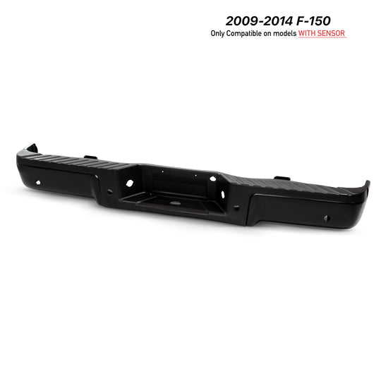 Regular price $265.99This is a 100% brand new piece of Black Replacement Rear Bumper Compatible With: 2009-2014 Ford F-150 ***For Styleside Bed Model Only*** ***Built Without Parking Sensor Holes & Without Towing Packing*** ***Hardware Brackets Lights and Step... -