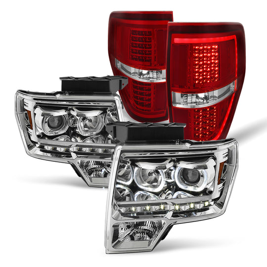 AKKON - For 2009-2014 Ford F150 Dual LED Halo Projector Chrome Headlight + C-Shape Red Strip Tail Lamps