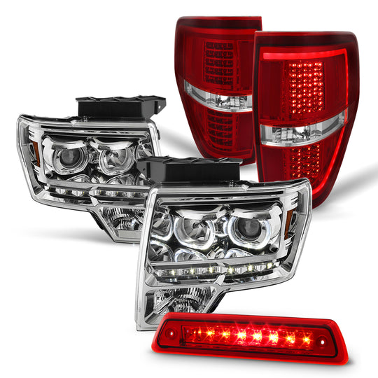 AKKON - For 2009-2014 Ford F150 Dual LED Halo Projector Chrome Headlight + C-Shape Red Tail Lamp+3rd Brake