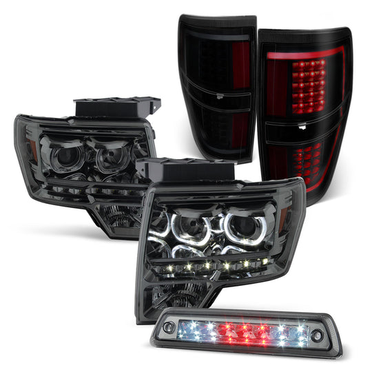 AKKON - For 2009-2014 Ford F150 Dual LED Halo Projector Smoked Headlight + C-Shape LED Tail + 3rd Brake