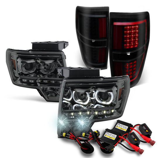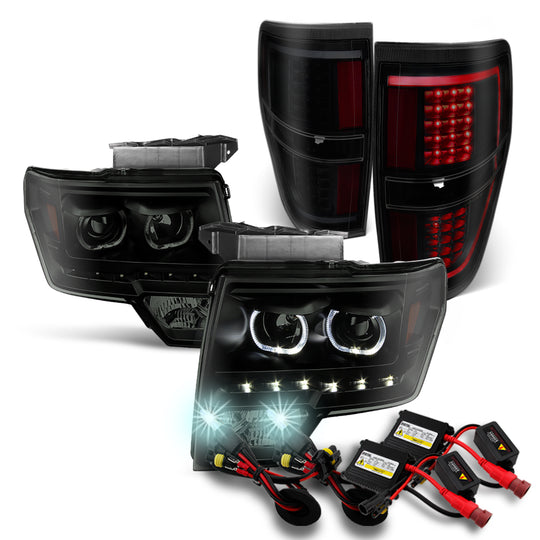 AKKON - For 2009-2014 Ford F150 Dual LED Halo Projector BlackSmoke Headlight + C-Shape LED Strip Tail + 8000K