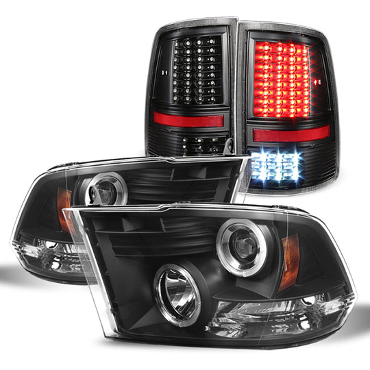 AKKON - For 2009-2018 Dodge Ram 1500 2500 3500 Black Halo Projector Headlights Pair + Black LED Tail Lights Left+Right Combo