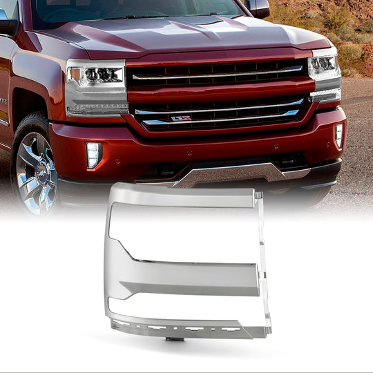 Regular price $98.99This is A Piece of Direct Fit Headlight Trim Bezel Cover Replacement Compatible With: 2016-2018 Chevy Silverado 1500 2019-2019 Chevy Silverado 1500 LD Manufacturer Part Number: ,,HLL-CS16-T-C-R Color: Chrome with Clear Len Light Bulb Type: -