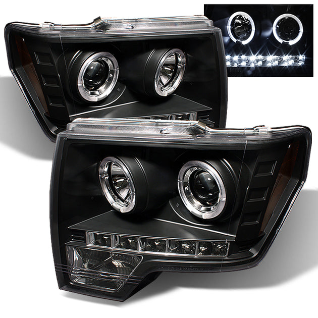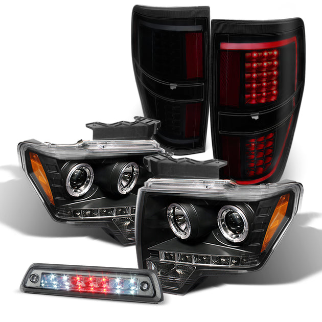 AKKON - Fits 09-14 Ford F150 Dual Halo Projector Black Headlights+ Black Smoke LED [Light Bar] TailLamp+ Smoke 3rd Brake Light