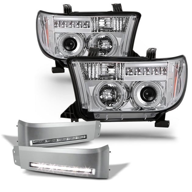 AKKON - Fits 07-13 Toyota Tundra Sequoia Dual Halo Projector LED Headlights Pair + Silver Bezel Panel DRL SMD LED Fog Light