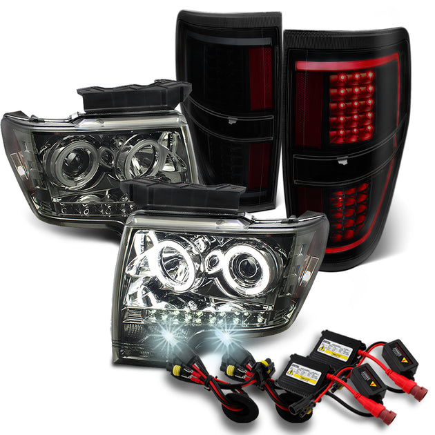 AKKON - Fits 09-14 Ford F150 CCFL Halo Projector Smoked Headlights + LED [C-Light Bar] Black Smoke Tail Lamp + 6000K HID Kit
