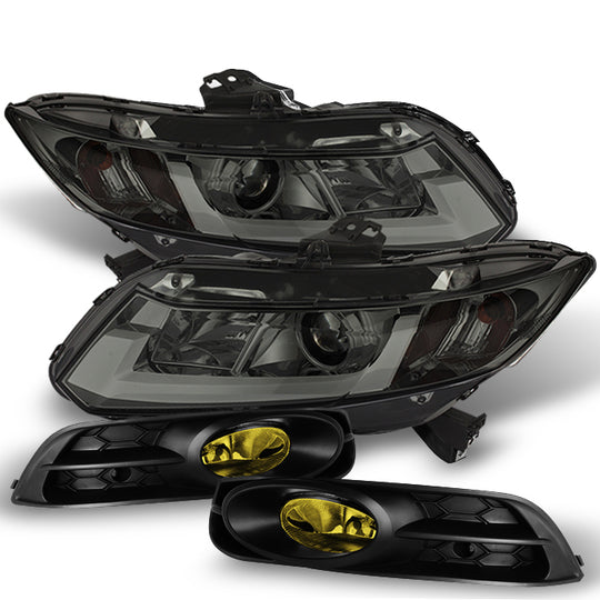 AKKON - For 2012-2013 Civic Coupe Smoked Tube Design DRL LED Projector Headlights + Yellow Fog Lights Pair