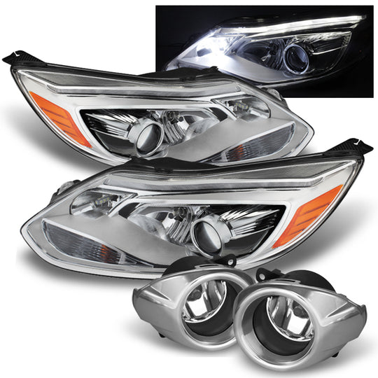AKKON - For 2012-2014 Ford Focus Chrome LED DRL Projector Headlights + Clear Fog Lights