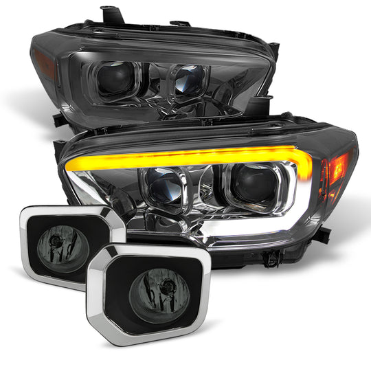 AKKON - For 2016-2023 Tacoma SR/SR5 Dual Square Projector LED DRL Smoked Headlights + Fog Light Assembly