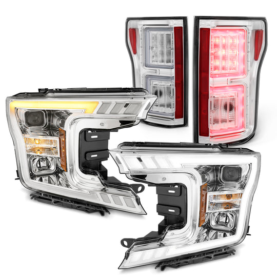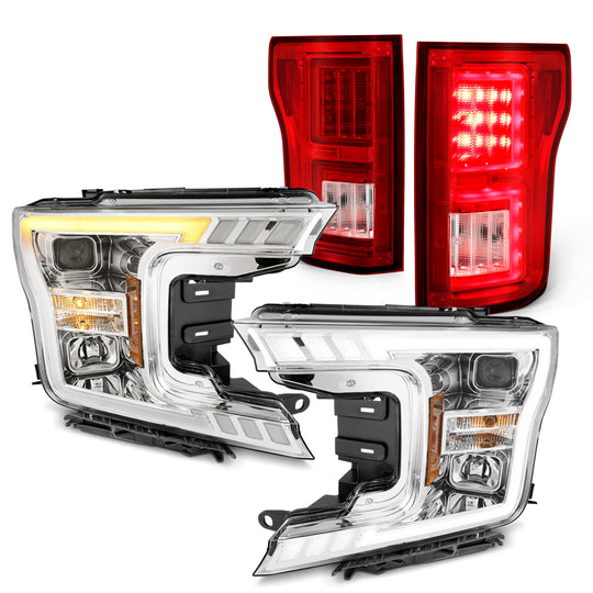 AKKON - For 2018-2020 Ford F150 LED DRL Tube Chrome Projector Headlights With Sequential Turn Signal + Chrome LED Tail Light