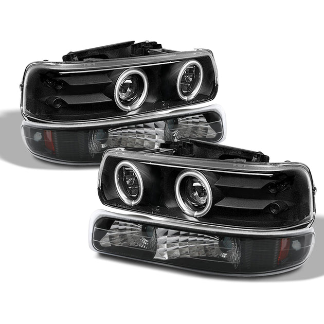 AKKON - Fits 1999-2002 Silverado 2000-2006 Suburban Tahoe Dual Halo Headlights + LED Bumper Lamps w/ Reflector - Black Housing