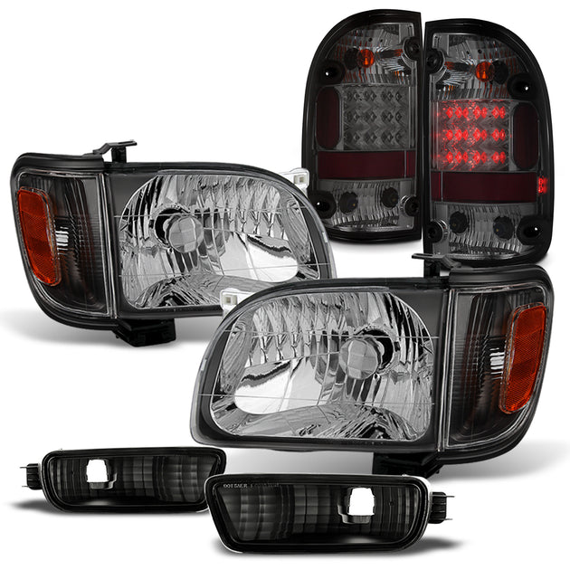 AKKON - Fits 2001 2002 2003 2004 Toyota Tacoma Pickup Black Headlights+ Corner+ Signal+ Bumper Lamp+ LED Smoked Tail Lights Pair