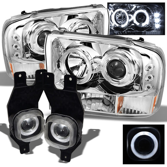 AKKON - For 99-04 F250 F350 F450 F550 Super Duty Dual Halo Projector LED Headlight+Projector Fog Lights W/Switch