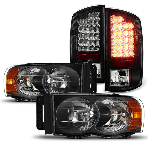 AKKON - Fits 2002 2003 2004 2005 Dodge Ram 1500/ 2500/ 3500 Pickup Black Headlights + Blk Tail Brake Lamp Pair Left+Right