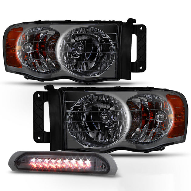 AKKON - Fits 2002 2003 2004 2005 Dodge Ram 1500 / 2500 / 3500 Pickup Smoked Headlights + LED 3rd Brake Lamp Pair Left+Right