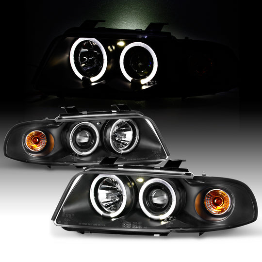 AKKON - For Audi A4 B5 Sport Sedan Black Bezel Dual Halo Ring Projector Headlights Replacement Lamp Left + Right