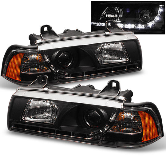 AKKON - For BMW E36 3 Series 4 Doors Sedan Chrome Clear DRL Daylight LED Strip Projector Headlights Lamps