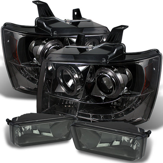 AKKON - For Chevy Suburban Tahoe Avalanche Smoked Halo Projector Headlights + Smoked Fog Lights Lamps