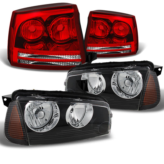 AKKON - For Dodge Charger Black Headlights With Corner Lights Replacement Pair + Red Clear Tail Lights Combo Set