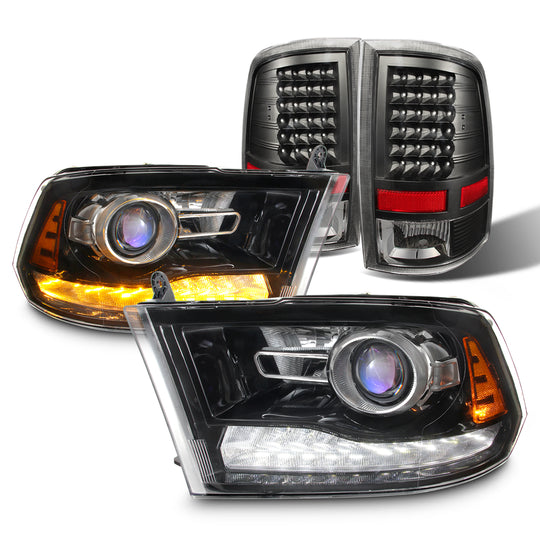 AKKON - For Dodge Ram 09-18 LED DRL Projector Black Headlights With LED Black Brake Lamp Taillights