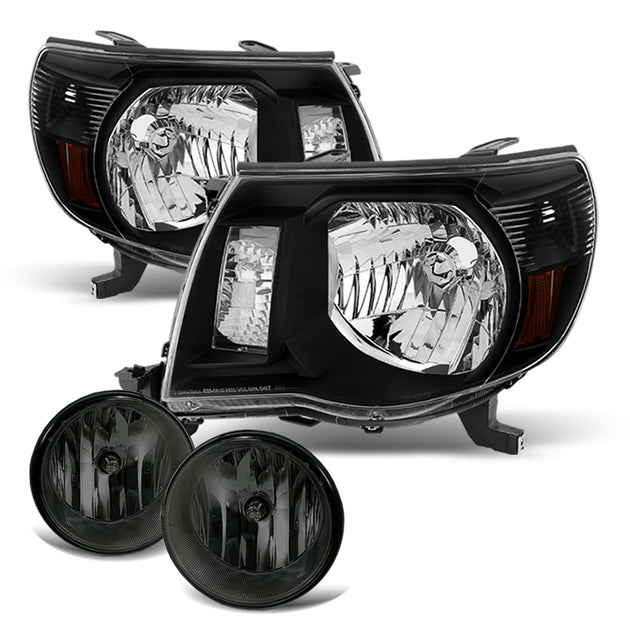 AKKON - Fits 2005-2011 Toyota Tacoma Pickup Truck Black Headlights + Smoked Fog Lamps Pair Left+Right Replacement