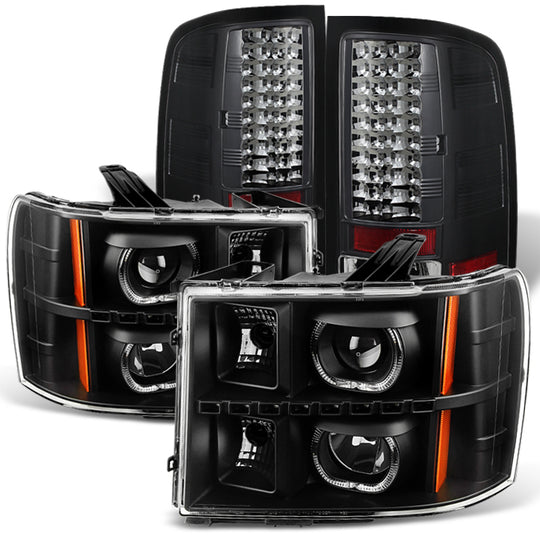 AKKON - For Exclusive Black GMC Sierra SMD DRL LED Halo Projector Headlights + Black LED Tail Lights Lamps
