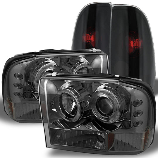 AKKON - For F250 F350 Halo Projector LED 1pc Headlights w/Bumper Signal Lamps + Black Smoke Tail Lights Combo