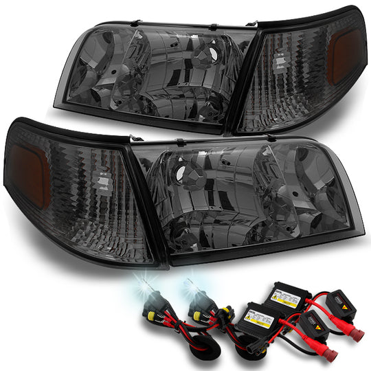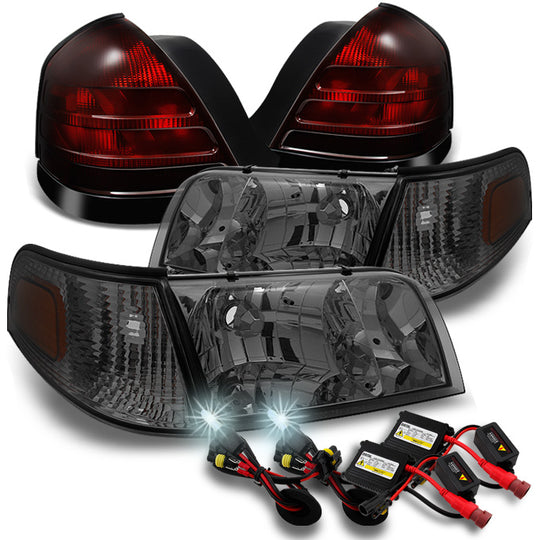Regular price $166.99This is a 100% brand new pair of Replacement Headlights & Tail Lights with the housing: Headlights: Smoke Lens, Tail Lights: Dark Red Lens With 6000K White Color Slim Ballast HID And It Fits 99-05 Ford... -