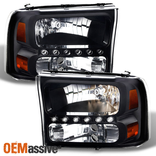 AKKON - For Ford F250 | F350 Superduty | Excursion Black Headlights with LED Bumper Lamps Replacement Pair Set