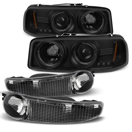 AKKON - For GMC Sierra 1500 Yukon Denali Black Halo Projector LED Headlights + Black Bumper Signal Lamps