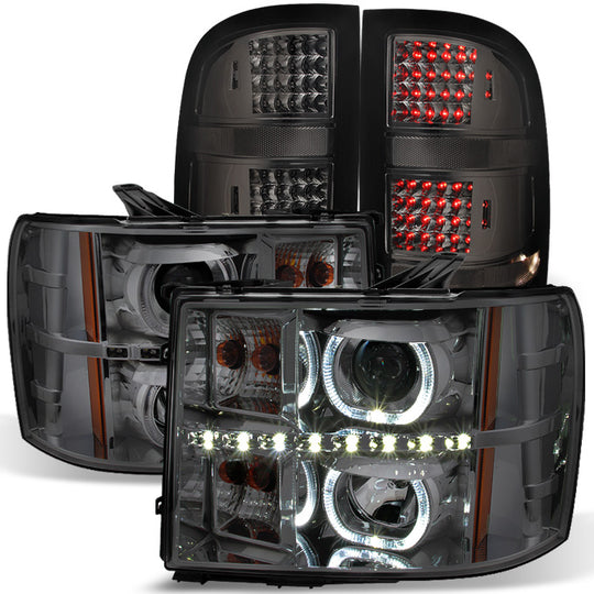 AKKON - For GMC Sierra Smoke Exclusive Halo Projector Headlights Pair + Smoke LED Tail Lights Combo Pair