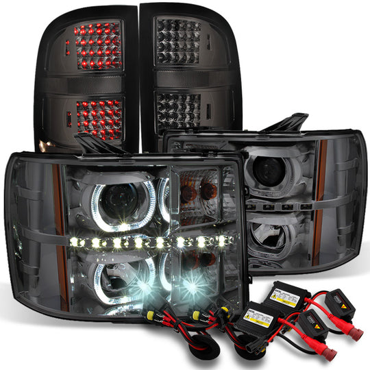 AKKON - For GMC Sierra Smoke Exclusive Halo Headlights + Smoke LED Tail Lights Pair + Slim 6000K HID Kit